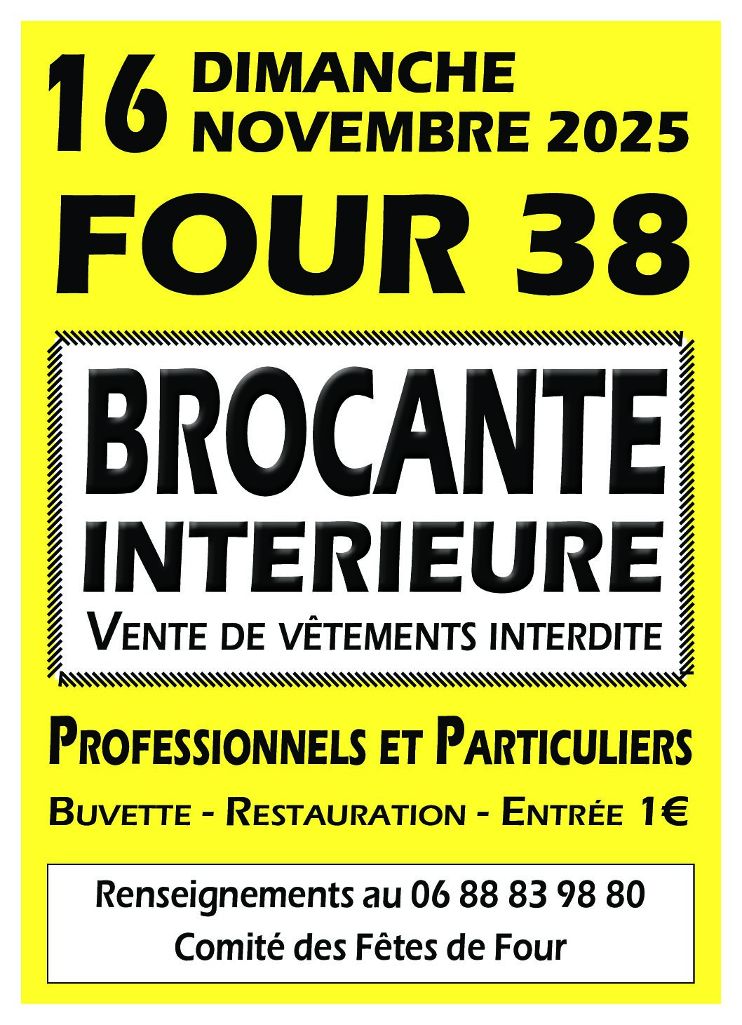 Le Comité des Fêtes de Four organise ses deux évènements annuels de novembre soient : la brocante qui aura lieu le dimanche 16 novembre à la salle polyvalente ainsi que le salon « A la découverte du Chocolat et les produits du terroirs » qui aura lieu le dimanche 30 novembre à la salle polyvalente également.