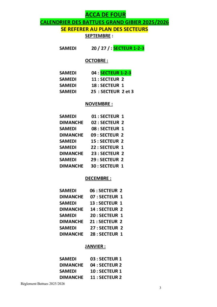 L’ACCA de FOUR adresse le calendrier des battus et les cartes correspondantes